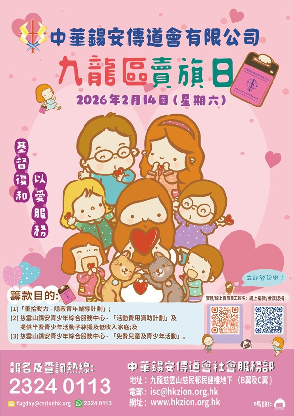 社會福利署署長已批准本會於2026年2月14日(六)於九龍區賣旗。本會與本地插畫師「一粒麥子」合作,以「基督復和 以愛服務」為主題,推動大眾認識本會「復和使命」─神與人、人與人 (包括自己 、人與自然環境) 的復和關係。